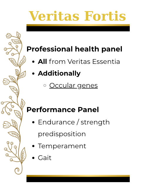 Veritas Fortis is an advanced genetic test that expands on foundational insights of Veritas Essentia test. It includes key genes related to the immune system, muscle function, brain health, reproductive system, hoof integrity, skin, connective tissue, and ocular health. Additionally, it features a specialized performance panel assessing three critical genes, enabling precise customization of training and care strategies to optimize athletic potential and overall well-being.