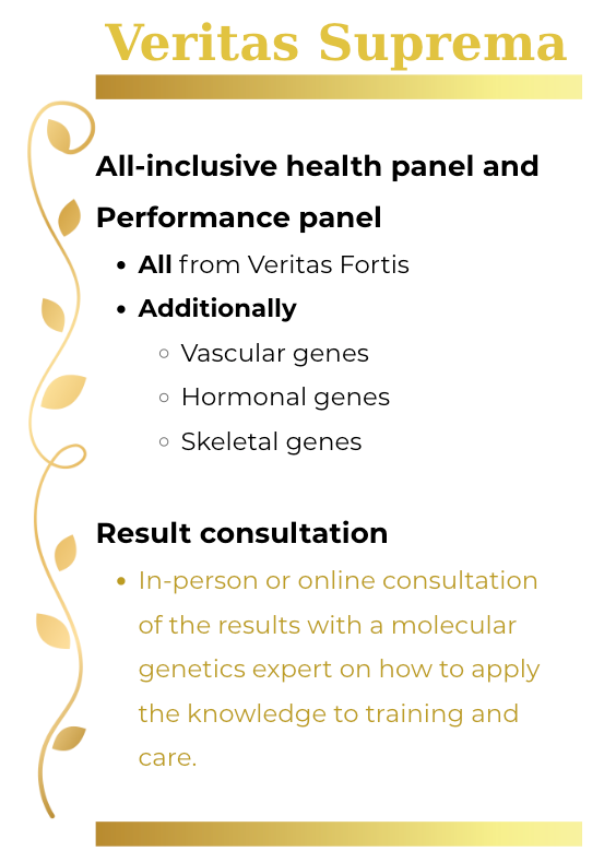 Veritas Suprema offers the most comprehensive genetic analysis available for showjumping performance horses. Building on the Veritas Fortis panel, it includes extensive screening of genes related to the immune, muscular, neurological, reproductive, hoof, skin, connective tissue, ocular, skeletal, hormonal, and vascular systems, as well as height determination markers. This in-depth profile provides valuable insights for optimizing breeding and training strategies. The package also features a personalized consultation with a genetic expert, available online or in-person, to help interpret results and guide decision-making.